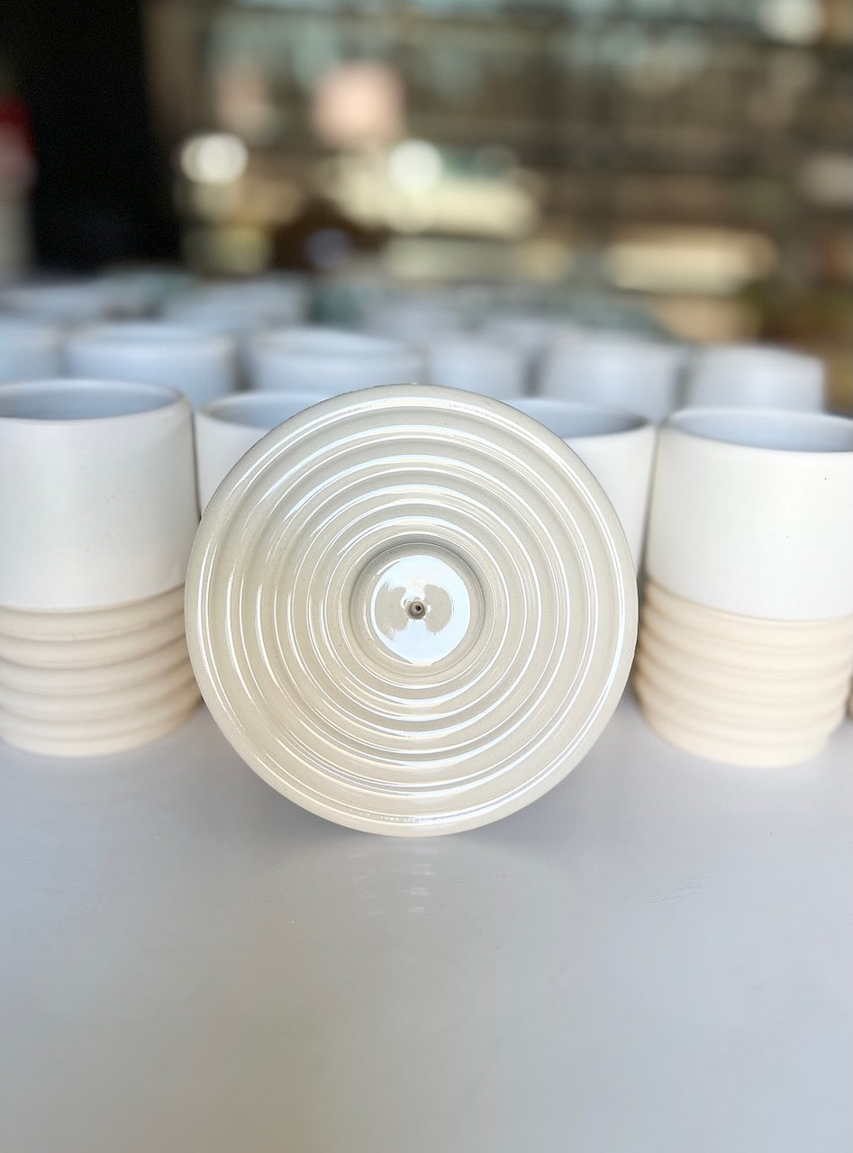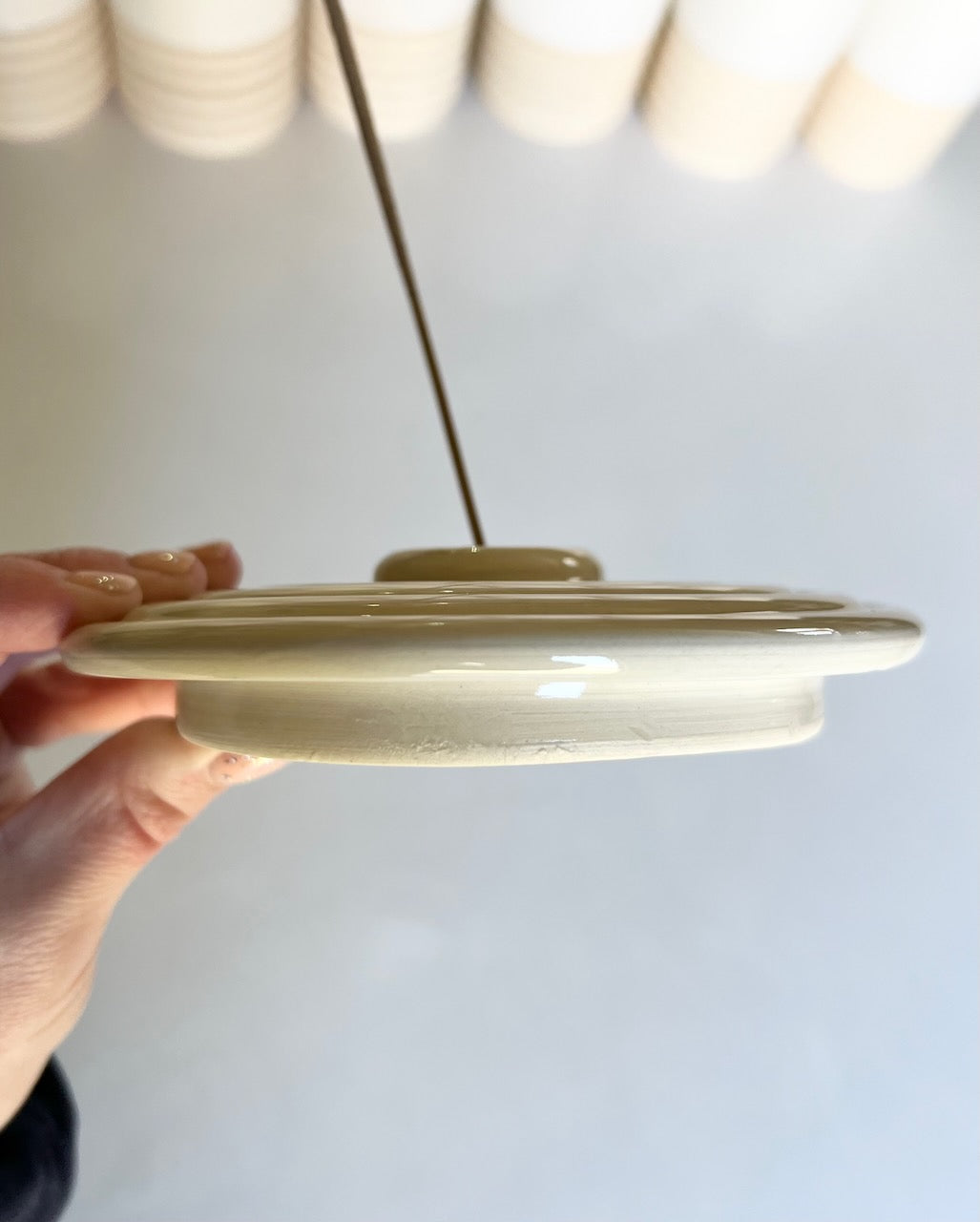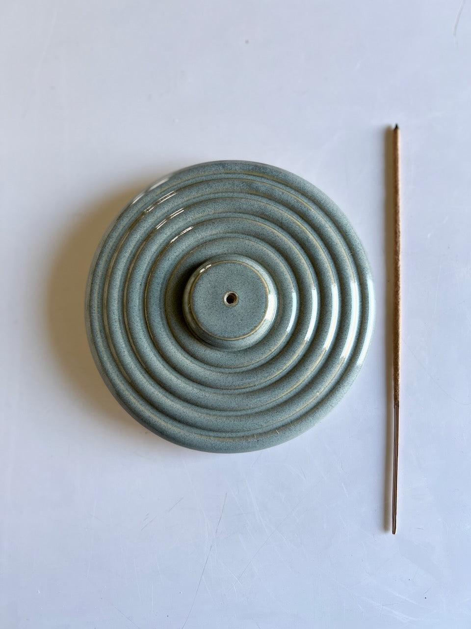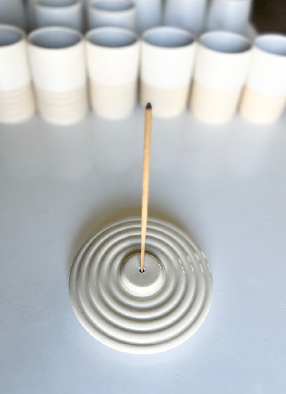 Porcelain incense holder with center hole for holding incense stick and a bottom foot. Available in Glossy Cream glaze and Opaque Ocean glaze.