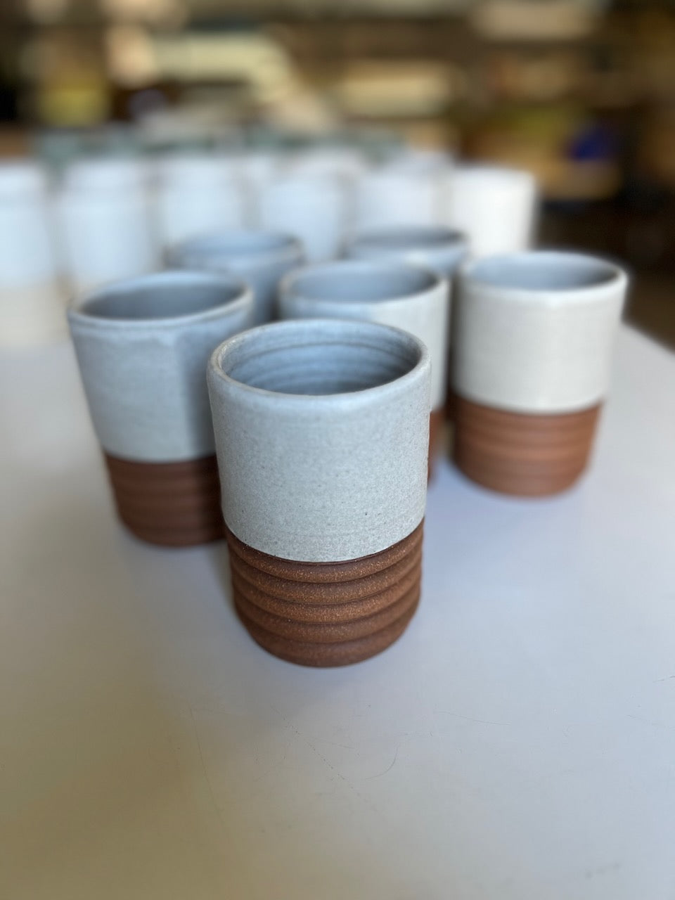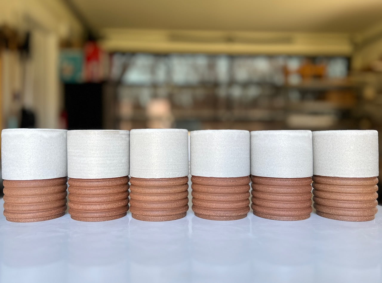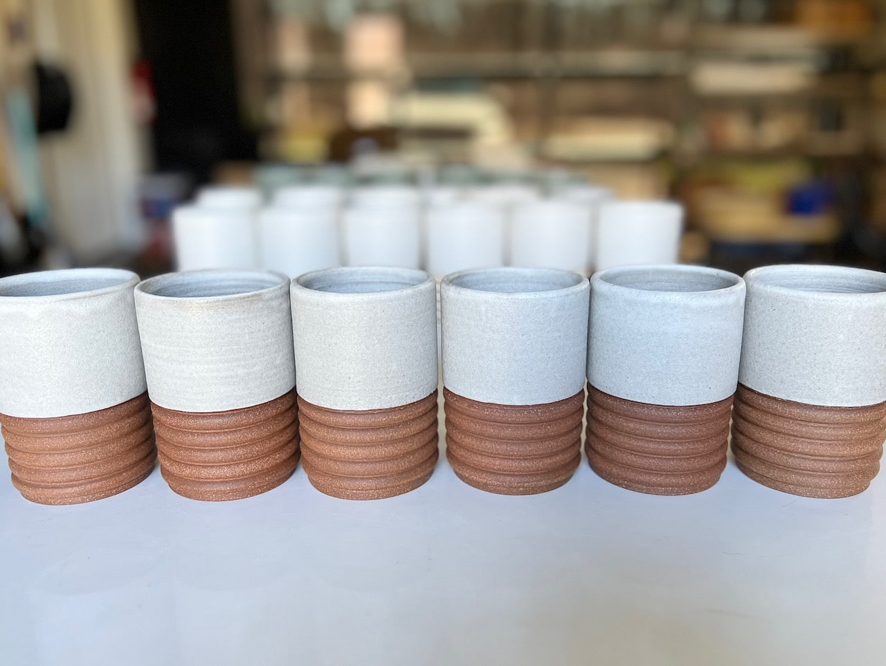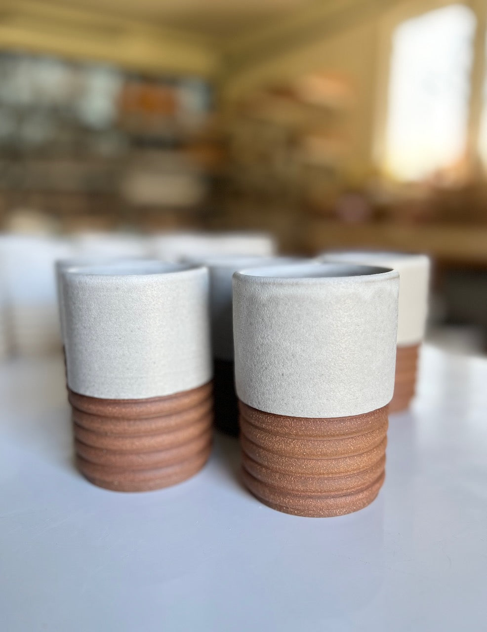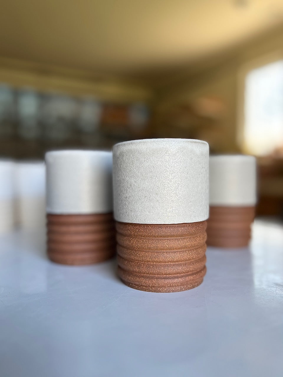 Translucent matte white glaze exterior with a raw ribbed dark clay body bottom half.