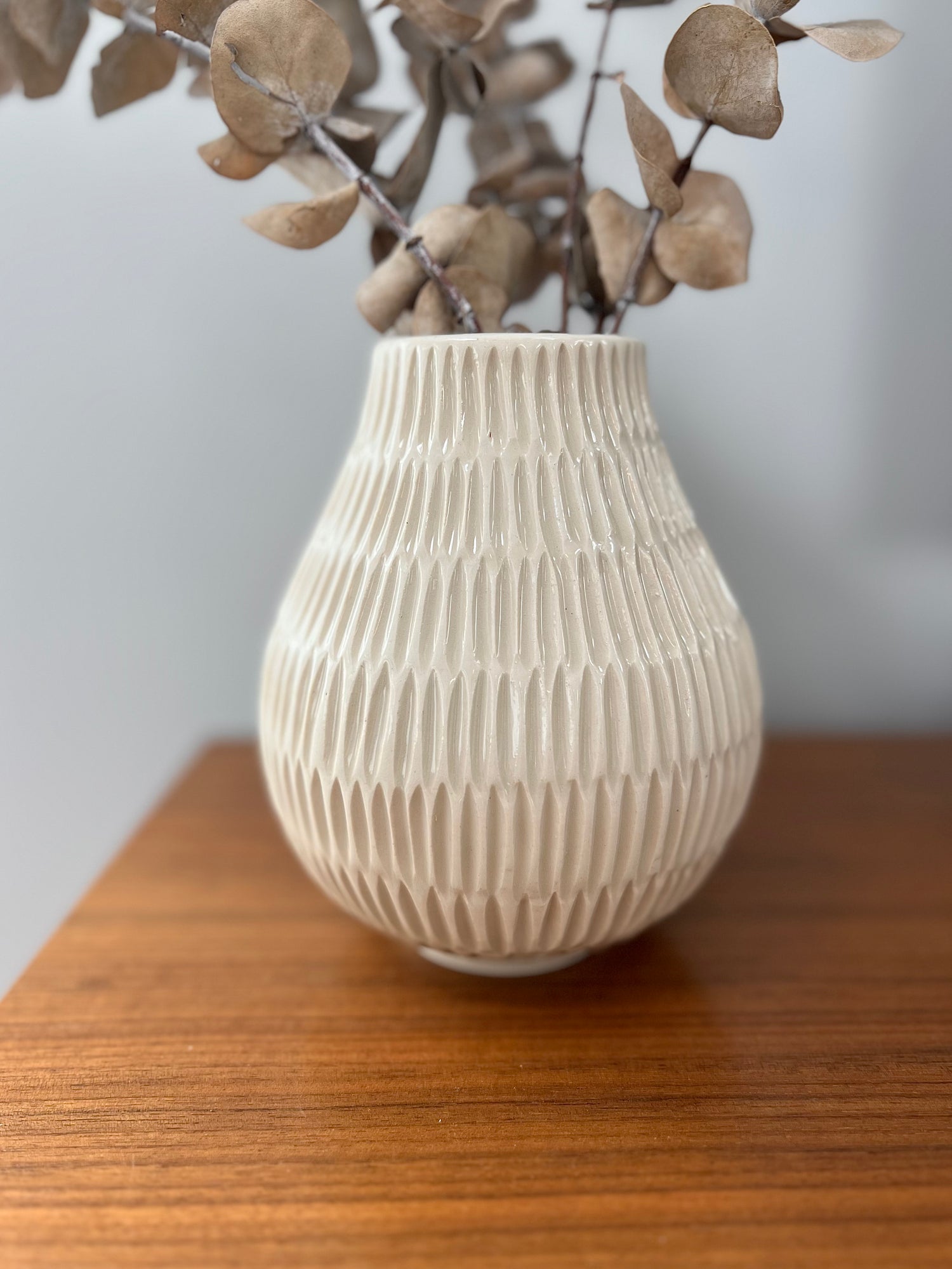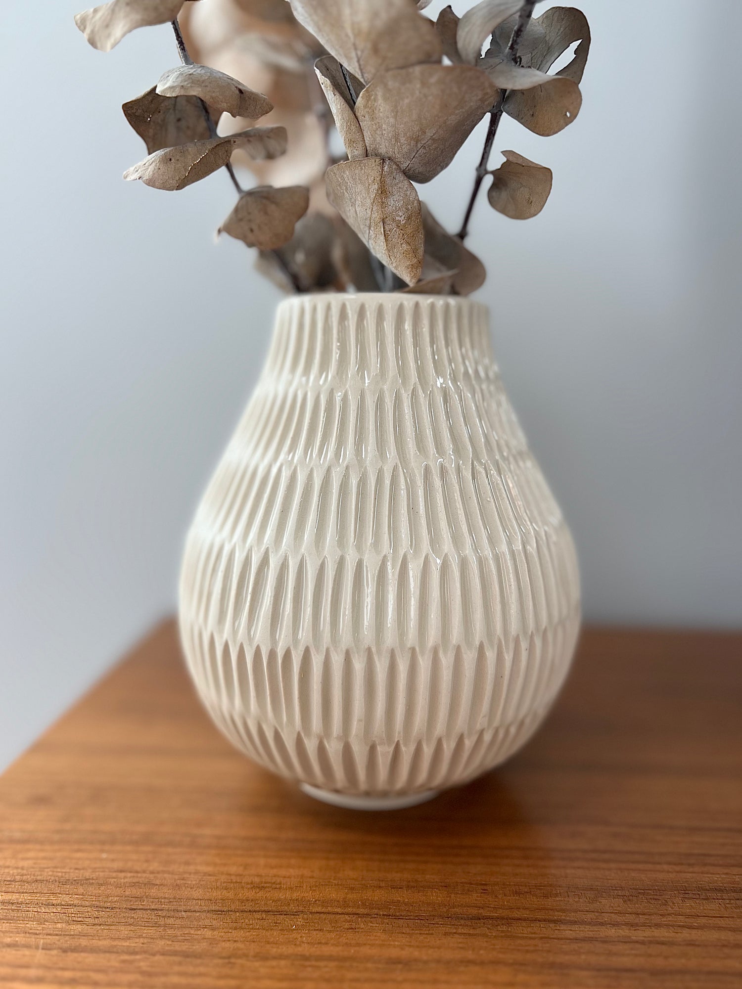 Small Carved Porcelain Vase. Glossy cream glaze.